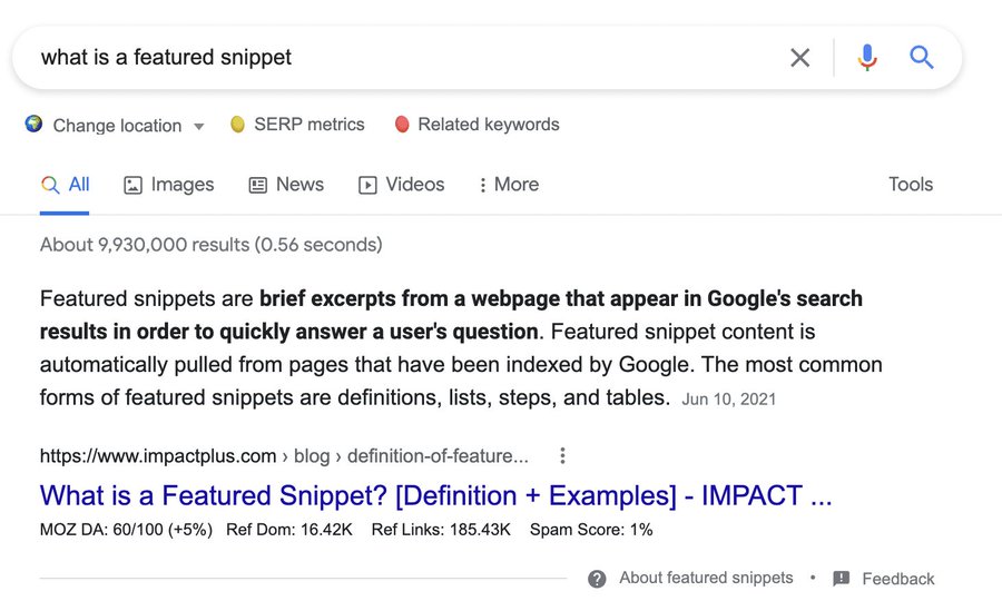 If you don’t already know what a featured snippet is, try googling “what is a featured snippet” and you will get a featured snippet about featured snippets.