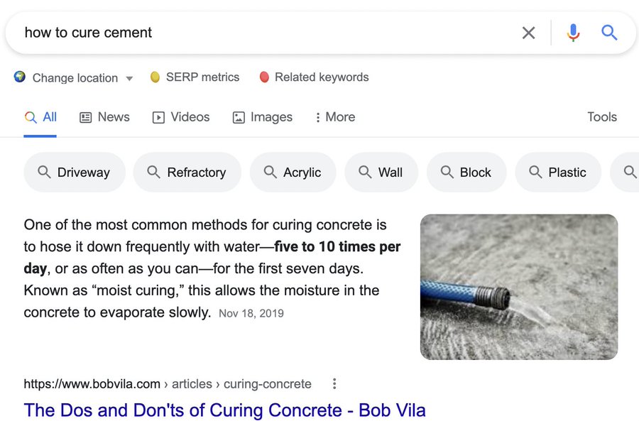 Try searching “how to cure concrete”. The resulting paragraph in the featured snippet is a